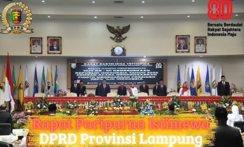Bandar Lampug — Gubernur Lampung Rahmat Mirzani Djausal, Wakil Gubernur Jihan Nurlela, unsur Forkopimda Provinsi Lampung, pimpinan dan anggota DPRD Provinsi Lampung, mengikuti Rapat Paripurna Istimewa DPRD Provinsi Lampung mendengarkan Pidato Kenegaraan Presiden Prabowo Subianto dalam rangka Hari Ulang Tahun (HUT) RI ke- 80, secara virtual, di Ruang Sidang DPRD Provinsi Lampung, Jumat (15/8/2025).